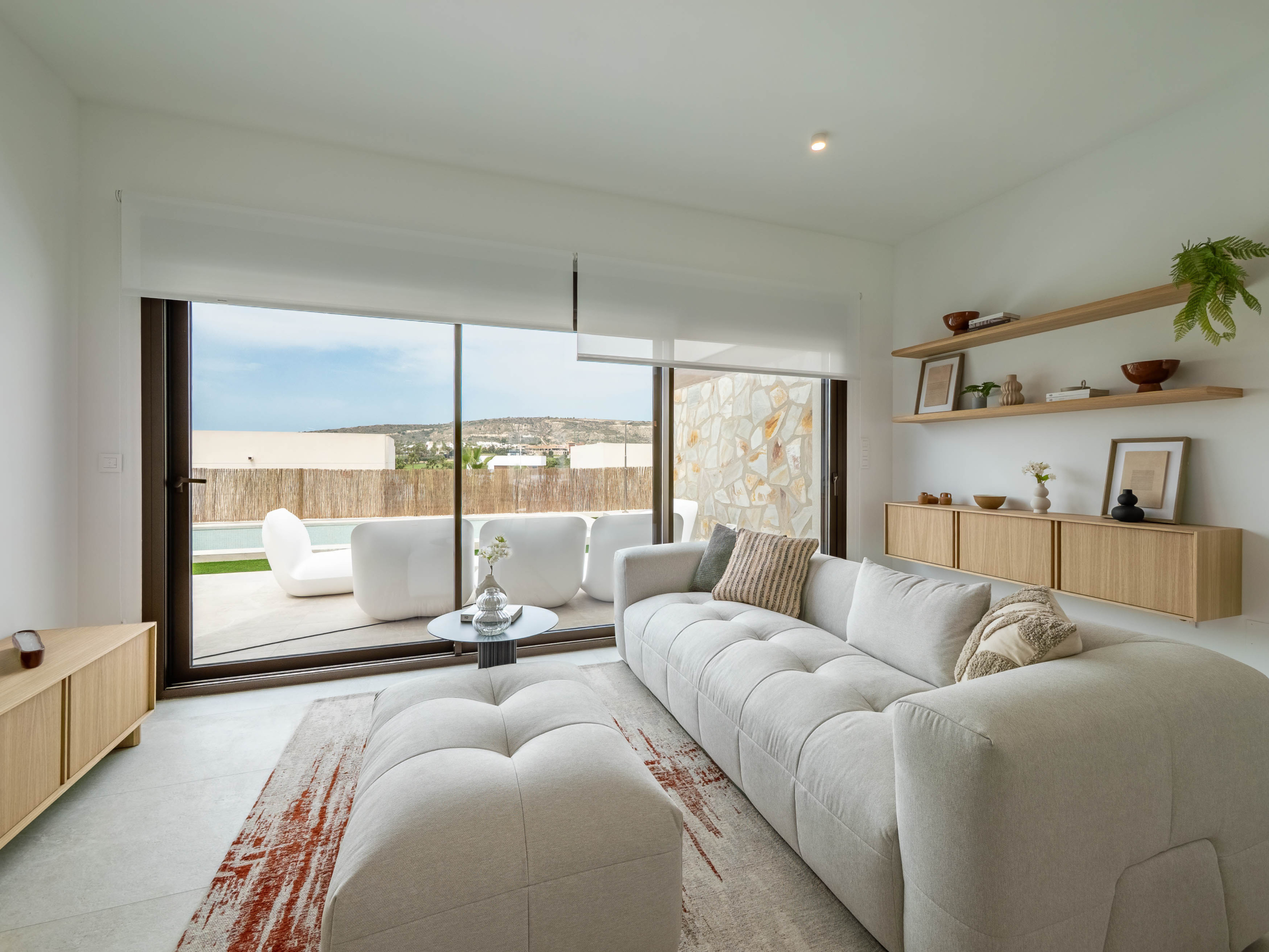 Spacious living room with open concept kitchen. The kitchen is of an elegant white design finished in wood, from which you can access directly to the pool area.