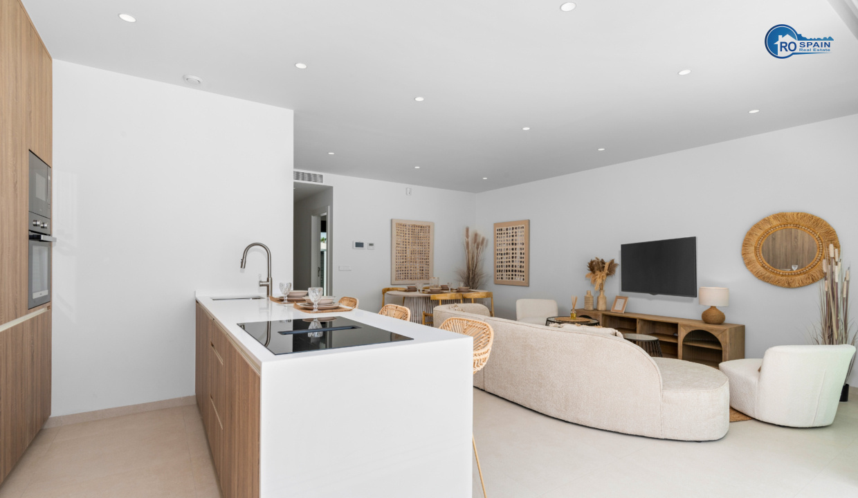 Jasny salon z otwartą kuchnią, wyposażoną w wysokie i niskie meble. Kuchnia ma nowoczesny design z drewnianymi wykończeniami i jest w pełni wyposażona w sprzęty AGD: płytę indukcyjną, okap, piekarnik, kuchenkę mikrofalową, pralkę, lodówkę i zmywarkę.