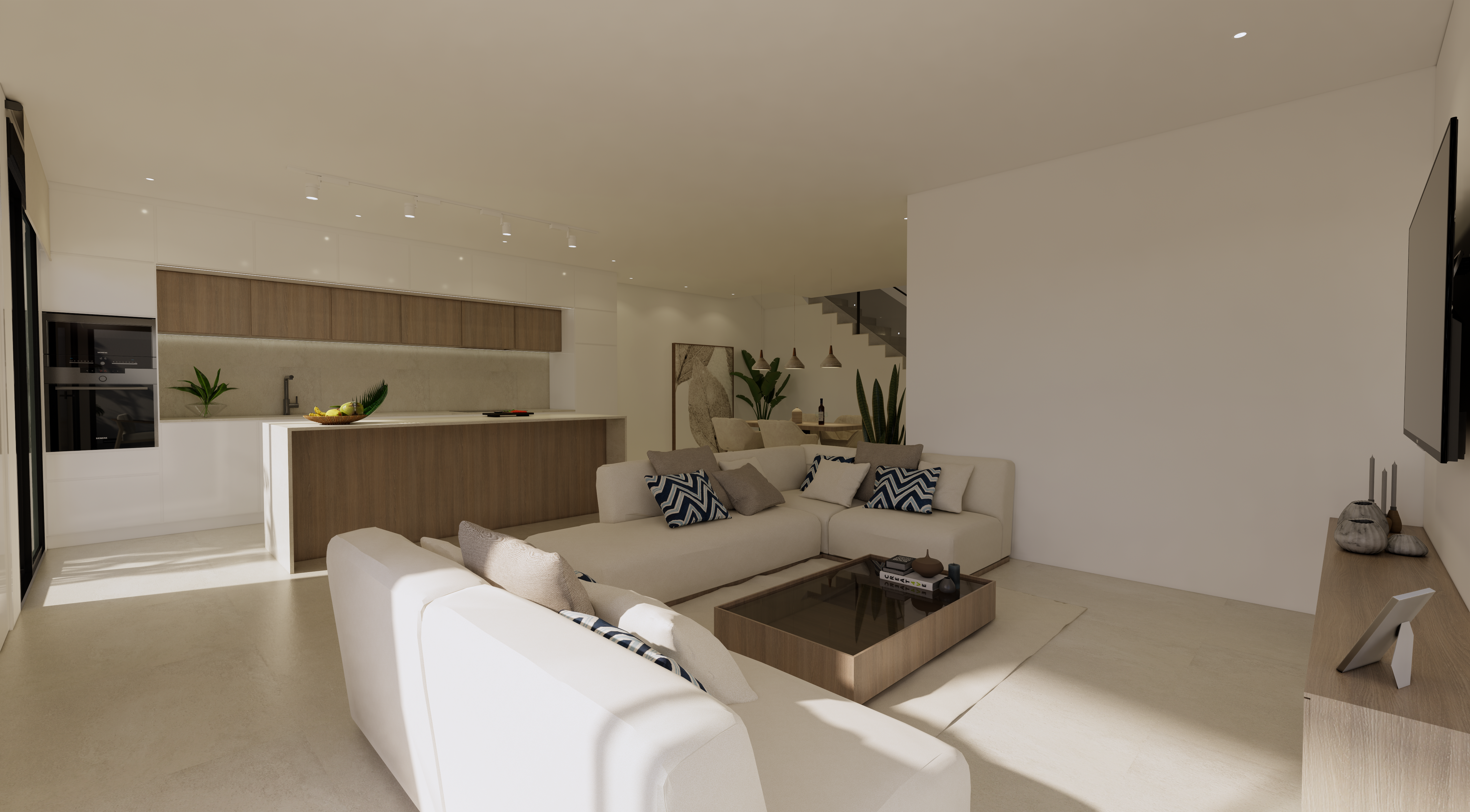 Wnętrza willi charakteryzują się otwartym i jasnym układem dzięki dużym oknom, które wizualnie i funkcjonalnie łączą salon z jadalnią z tarasem na zewnątrz. Parter koncentruje się na przestrzeni open‑space, w której znajduje się nowoczesna kuchnia z wyspą centralną, zaprojektowana z myślą o współczesnym stylu życia. Wnętrza zostały stworzone, aby zapewnić komfort, przestronność oraz organiczne połączenie z otoczeniem, tworząc zrównoważone i eleganckie środowisko mieszkalne.