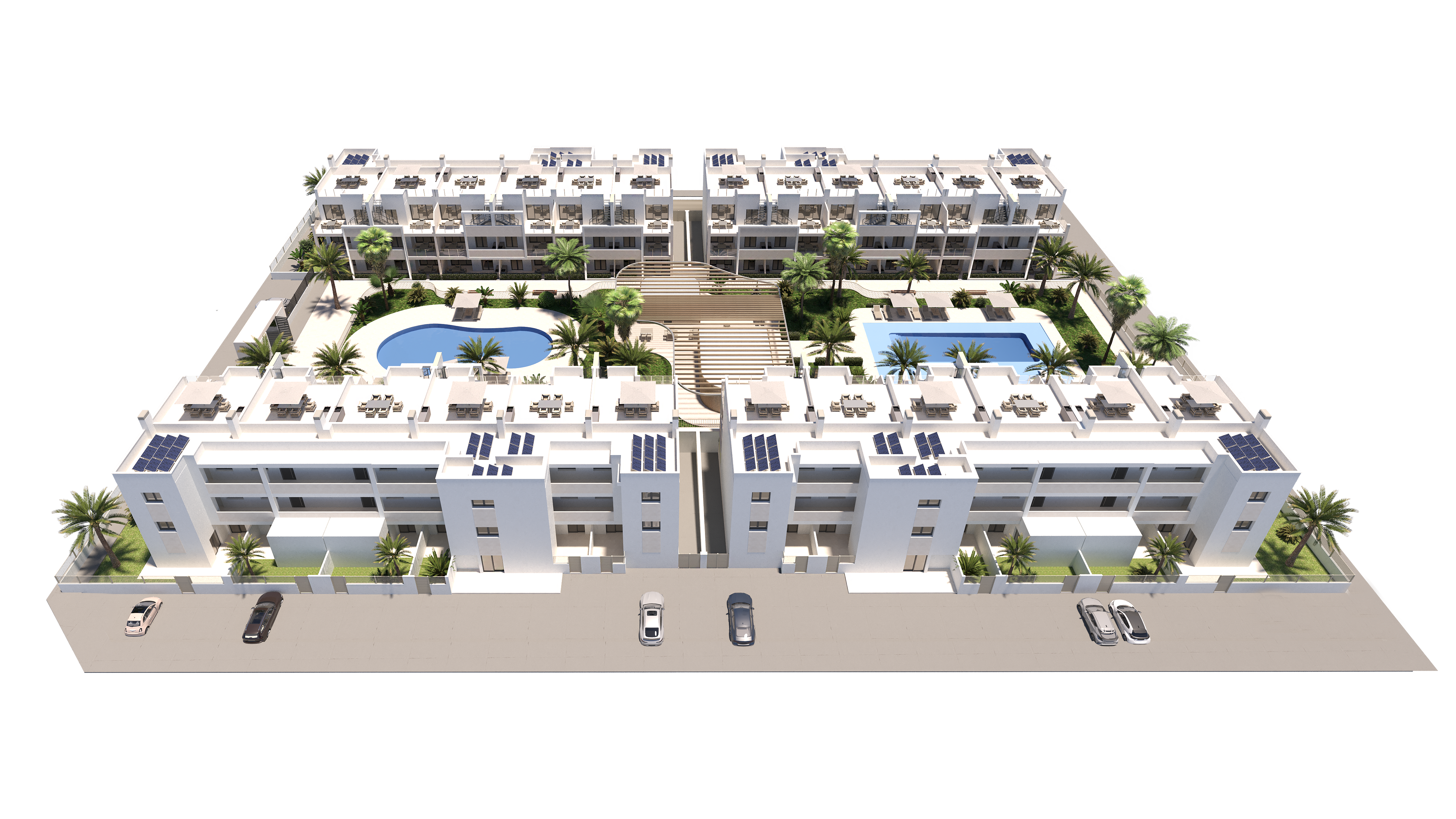 Het project bestaat uit 72 zorgvuldig ontworpen appartementen met 2 en 3 slaapkamers, geïntegreerd in de omgeving om lichte, functionele en comfortabele ruimtes te bieden. De woningen beschikken over ruime gemeenschappelijke ruimtes, twee gedeelde zwembaden en zones voor ontspanning en recreatie, wat een aangename en rustige woonomgeving creëert.