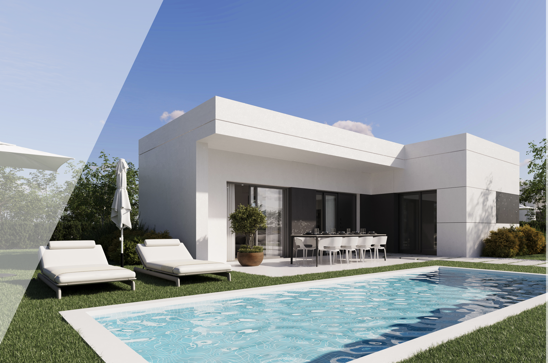 Twee vrijstaande eengezinsvilla’s met een modern ontwerp, strakke lijnen, eigentijdse geometrie en grote raampartijen die zorgen voor veel natuurlijk licht. Elke woning wordt gebouwd op een privéperceel — respectievelijk 800 m² en 950 m² — met exclusieve toegang via een gedeelde privéweg en een eigen tuin. Een privézwembad is optioneel beschikbaar.