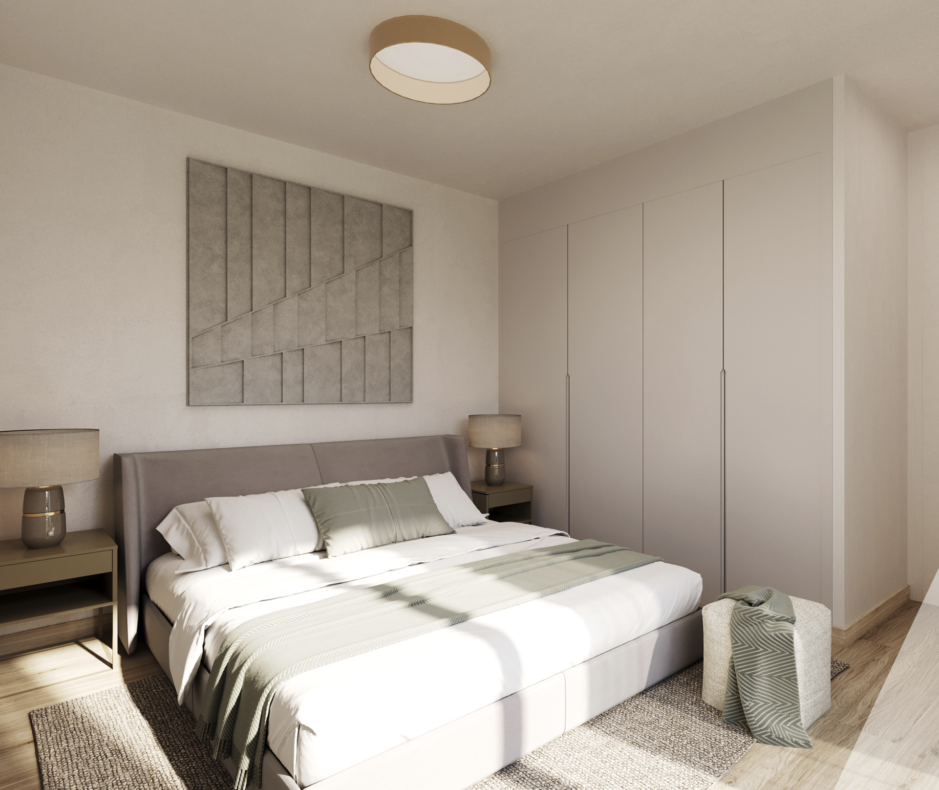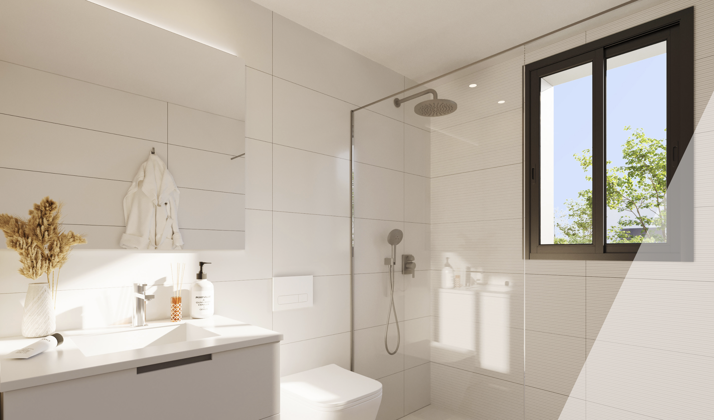 De woningen hebben een bebouwde oppervlakte van 75,32 m² en beschikken over een open woon-eetkamer-keuken, twee slaapkamers en twee complete badkamers met moderne matzwarte afwerkingen, antislip douchebakken in hars met verborgen lineaire afvoer en glazen douchewanden.